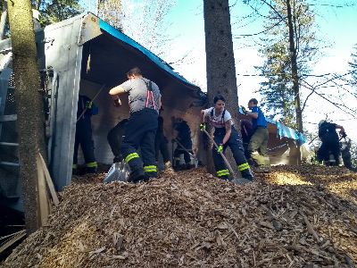 Um 13.28 wurde die FF Ampflwang zu einer Fahrzeugbergung am Hausruck alarmiert. Ein mit Hackschnitzeln beladener Sattelzug ist in einer Kurve umgestürzt. Zur Bergung waren die Kranfahrzeuge aus Vöcklabruck und Ried im Innkreis notwendig. Um ein Aufstellen des Fahrzeuges zu ermöglichen, war es notwendig, den Sattelzug vollständig zu entleeren. Daher wurden noch die FF Aigen und Schlagen nachalarmiert. Nach ca. 1 Stunde schweißtreibender Schaufelarbeit konnte das Fahrzeug aufgestellt und anschließend abgeschleppt werden. Die B 143 war während der Bergearbeiten ca. 4 Stunden für den gesamten Verkehr gesperrt. Die FF Aigen war mit 2 Fahrzeugen und 14 Kameraden/innen im Einsatz.