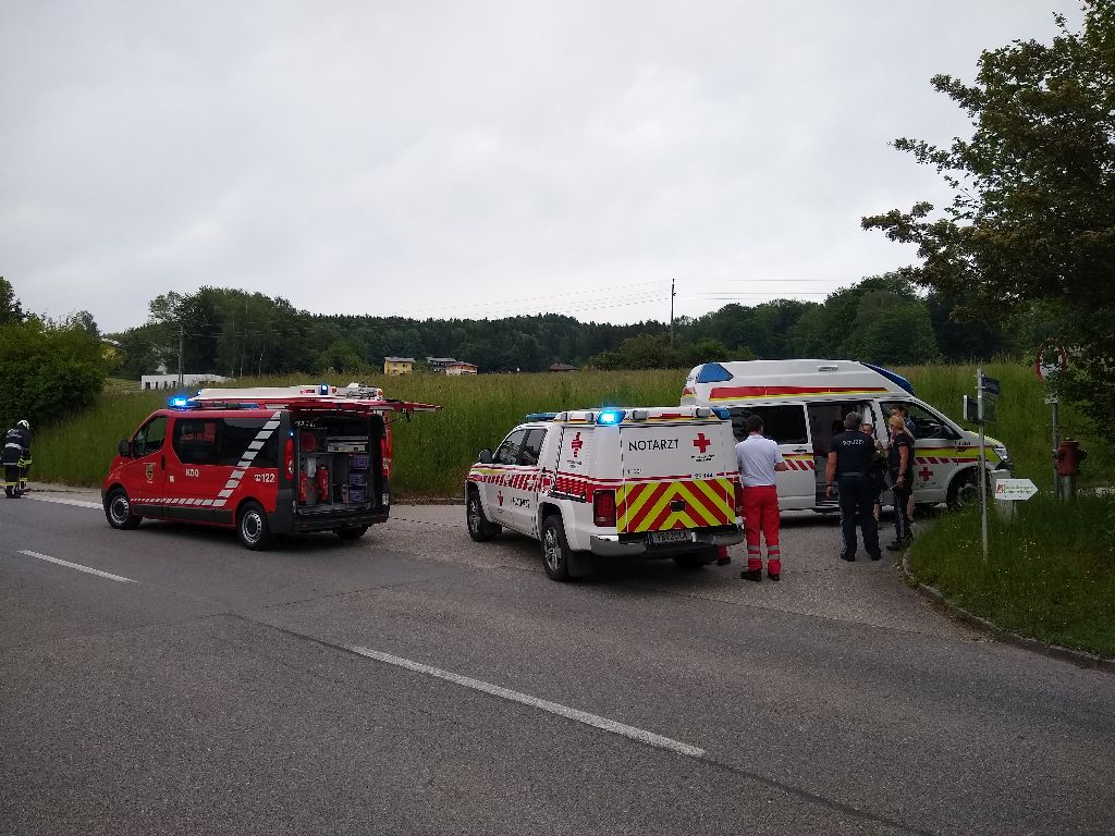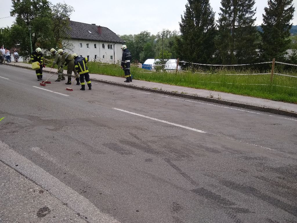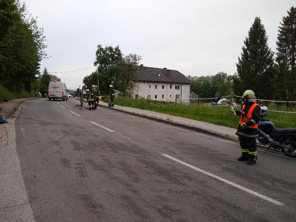 Kurz nach 18 Uhr wurde die FF Aigen zu Aufräumarbeiten nach einem Verkehrsunfall auf der B 143, Höhe Abzweigung nach Schierling, mittels Sirene alarmiert. Nach einer Kollision eines Motoradfahrers/in mit einem PKW war es notwendig, die Straße von ausgelaufenem Öl und herumliegenden Fahrzeugteilen zu reinigen. Die verunfallte Person wurde vom Notarzt und Roten Kreuz versorgt. Nach ca. 1 Std. konnten die 11 Kamerad/innen der FF Aigen wieder ins Feuerwehrhaus einrücken.